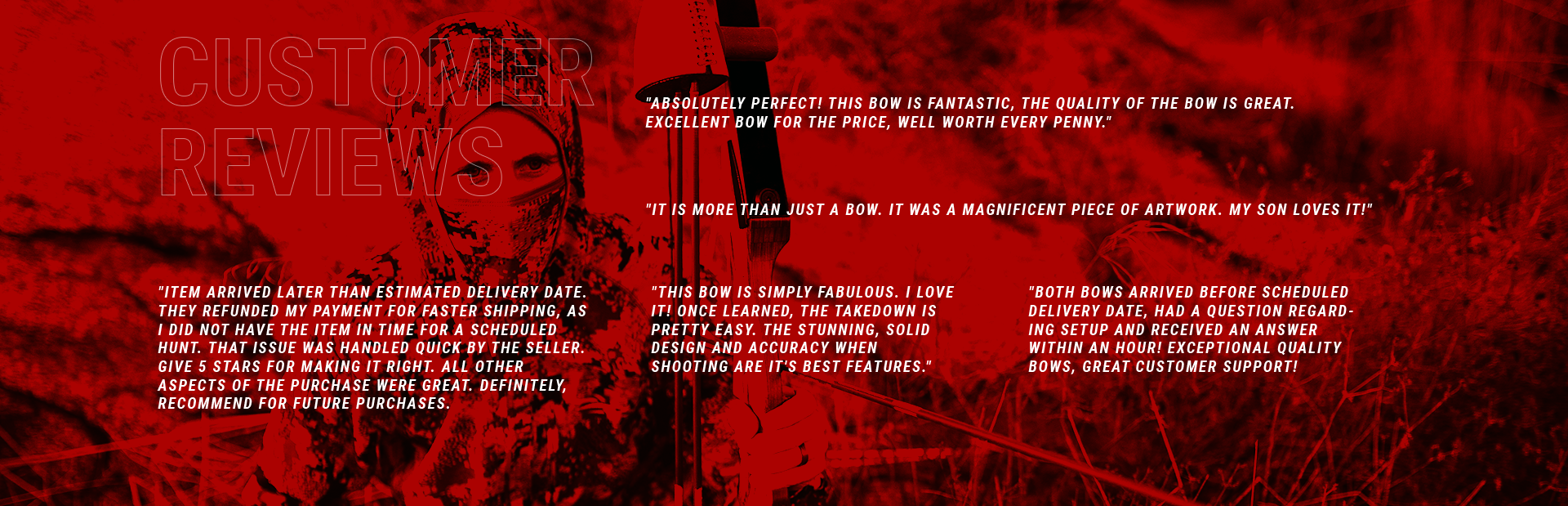 "Both bows arrived before scheduled delivery date, had a question regarding setup and received an answer within an hour! Exceptional quality bows, great customer support!